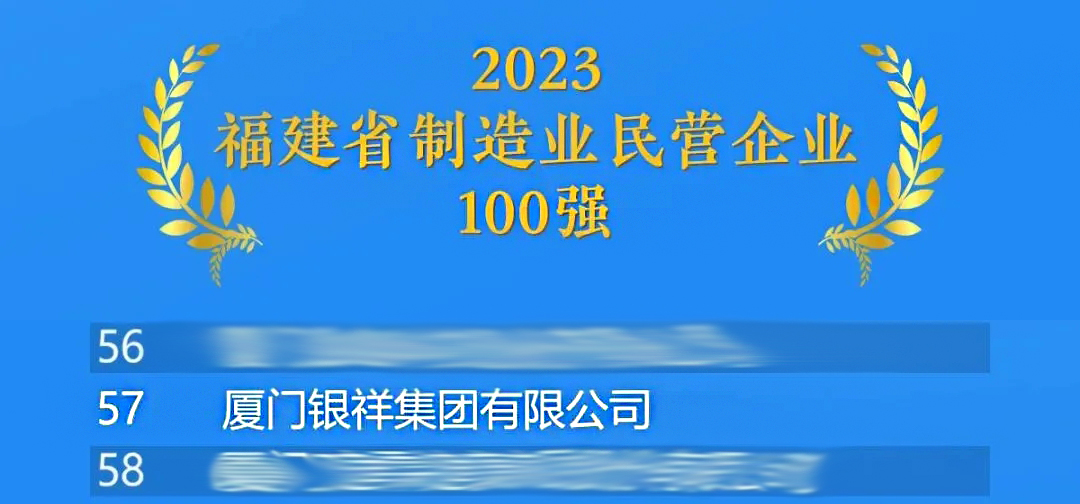 9月19日,2023福建省民營(yíng)企業(yè)100強(qiáng)發(fā)布會(huì)在龍巖市舉行。會(huì)上,省工商聯(lián)發(fā)布了福建省制造業(yè)民營(yíng)企業(yè)100強(qiáng)等4個(gè)榜單及百?gòu)?qiáng)分析報(bào)告。銀祥集團(tuán)已連續(xù)6年上榜,位列制造業(yè)民企百?gòu)?qiáng)榜單第57名。