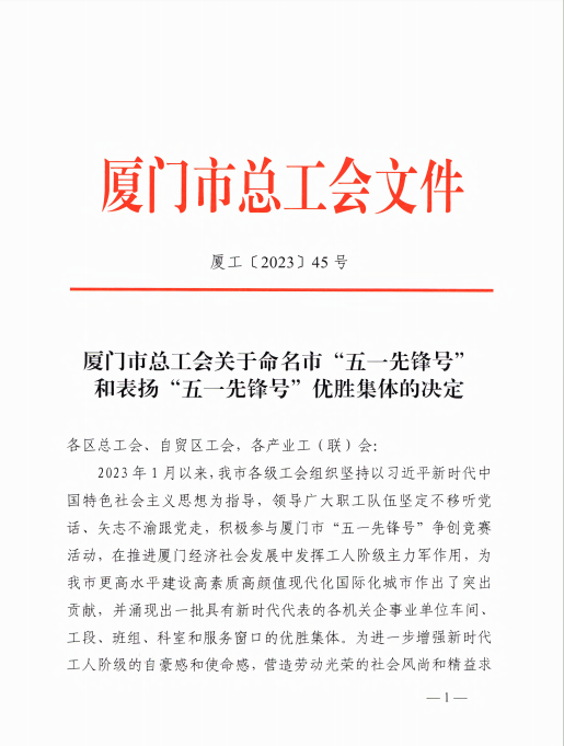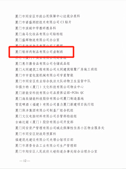 2023年1月以來,廈門銀祥集團有限公司工會組織以習近平新時代中國特色社會主義思想為指導,一直積極參與“五一先鋒號”爭創(chuàng)活動。為進一步增強新時代工人階級的自豪感和使命感,營造勞動光榮的社會風尚和精益求精的敬業(yè)風氣,廈門市總工會授予廈門銀祥肉制品有限公司鹵制班廈門市“五一先鋒號”先進集體稱號。